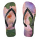 These flip flops are like a puzzle w a beautiful photo of a peach and lavender iris across both.