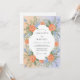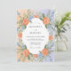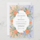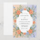 A vibrant palette of peach and blue defines this floral design, featuring lush roses and delicate wild sprigs. Soft sage green foliage weaves throughout the arrangement, set against a subtle gradient backdrop. This botanical artwork creates a fresh and airy atmosphere for a seasonal ceremony.