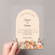 For an elegant and romantic wedding. A clear, transparent background decorated with orange, peach and pink florals. Arch shaped frame. Personalize and add your names and details.