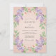 This romantic design features a warm peach backdrop adorned with lush purple lilacs and delicate pink blossoms. Ethereal watercolor strokes create a soft, airy atmosphere perfect for a springtime nuptial. Vibrant green leaves complement the pastel palette, adding a touch of nature-inspired elegance. The botanical arrangement evokes a sense of whimsical charm and timeless beauty.