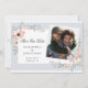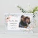This photo save the date offers a beautiful peach watercolor floral graphic accented with a light dusty blue border.