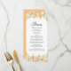 Add brightness and sparkle to your event with this floral menu card. It features watercolor peach flowers with faux gold foil leaves. The perfect menu card for spring weddings, bridal showers, baby showers and other events.