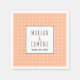 This wedding paper napkin combines a modern touch with a vintage vibe, featuring a beautiful black and white hand-drawn style design. Each detail is carefully accented, adding a unique charm to the napkin. The couple's names are elegantly showcased in hand-drawn style typography, adding a personal touch to the design. The names are placed on a white frame, which is surrounded by a lovely geometric pattern in peach and white.