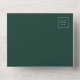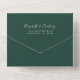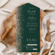 The left-hand edge of this elegant modern all-in-one wedding invitation and RSVP features a peach faux glitter border. The customisable text combines peach whimsical handwriting, copperplate and italic fonts on an emerald green background. The return address appears on the outside flap and the reverse side of the detachable RSVP card in peach text on solid green.