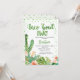Sweet taco bout two second birthday invitation featuring some peach colored flowering cactus and succulents. This fiesta themed 2nd birthday invitation also features some green watercolor dots and green watercolor heading and is ideal for a girl's second birthday party.