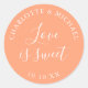 Peach wedding favor love is sweet classic round sticker. Designed by Thisisnotme©