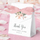 Elegant floral favour boxes for bridal shower, baby showers or birthday parties feature a posy of peach and blush pink flowers adorned with lush botanical greenery. Personalise with three lines of custom text in chic calligraphy script and block typography; shown with "thank you," the event type or occasion, and the date. Designed to coordinate with our Peach Meadow invitation collection.