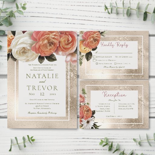 This beautiful floral design features a bouquet filled with peach, pink, and white flowers with a champagne gold glitter background. It's part of the Peach Mimosa Blooms Floral Wedding Suite collection of cards created by Simply Farmhouse Press.