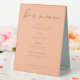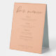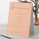 Peach is the new trending colour for summer weddings. Our sweet peach wedding bar menu table tent sign features elegant light brown script detailing your drinks for a trendy, minimalist event in the afternoon. Great soft colour for a feminine bride who loves to stay current and modern.
