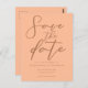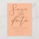 Peach is the new trending colour for summer brides. Our sweet peach wedding Save the Date postcard features elegant light brown script for a trendy, minimalist event in the afternoon for a feminine bride who loves to stay current and modern.