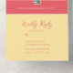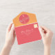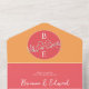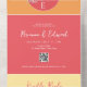 Trener, minimalist, modern, contemporary peach orange and yellow all-in-one wedding invitation with QR code, monogram with hand drawn love couple birds, trendy handwritten script and custom picture of the at the back.