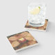 The coasters are gorgeous, a quality feel and heavy weight. They look like a precious archeological find. A rustic stone juxtaposed with a modern floral black and white print. I like the way the print goes slightly imperfect on the cut stone edges giving them a kind-of natural beauty.