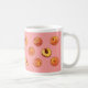 Mug with cheerful peach drawing design. Pink background. This coffee mug with 17 different original peach drawings will brighten your morning and afternoon. Makes a great gift for yourself or others for any occasion.