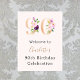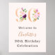 A peach coloured background. Decorated with foral numbers in faux gold and pink. Personalise and add a name and age.