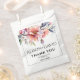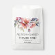 This elegant wedding favor bag showcases a beautiful rhododendron branch adorned with peach-pink flowers and greenery at the upper part. The couple's names are prominently displayed in decorative typography, adding a personal touch to the design. A heartfelt message of 'Thank You' is also included, expressing gratitude to the guests. Completing the look, an elegant thin black border gracefully adorns the bag, adding a touch of sophistication to any wedding celebration.