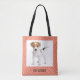 A stylish personalised bag featuring a photo of your dog on the front, with their name underneath in elegant lettering. The tote bag is peach with a chic polka dot pattern. Ideal for everyday use, the bag makes an ideal gift for dog lovers.