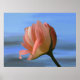A pretty, painted, peach coloured rose bud is barley opened as it reaches up towards a blue sky.