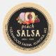 Peach salsa ingredients (peaches, onions, peppers) on black with rustic kraft border; net weight, date and ingredients