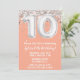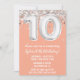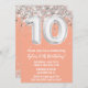 Peach and silver 10th Birthday party invitation age 10 birthday invitation with black white silver with modern script writing and fun foil balloons.