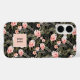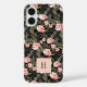 Elegant floral patterned case features peachy pink watercolor peonies and lush green foliage on a contrasting black background. Personalise with your single initial monogram in classic white lettering to make this chic floral case your own.