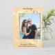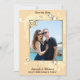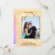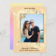 Peach coloured background with Diamonds and Frame with bow Image Save the Date Invitation on the front. Peach, pink, purple, and blue background on the back of this flat card. Convert this for any occasion. Add a photo of the happy couple to where the frame is and add text on the back instead. Be sure that the photo is below the framed image. Or a photo on the back of the card.