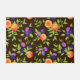 Greenery and fruit botanical pattern, peaches and plums with green leaves. Orange and red peaches, dark blue and purple plums, and magenta plums. Colours pop on dark background. Cute, playful, bold pattern.
