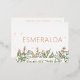A girly and floral non-photo birth announcement with butterflies in foil in postcard form. Florals in peachy colours and sage green greenery. The stats of your baby you are at the front of the postcard.