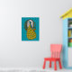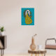 A peacock, with his colourful plumage trailing behind him, admires himself in an ornate gold-framed mirror against a teal blue trellised background on this poster print. From my original digitally-created image.