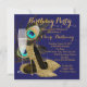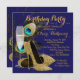 Elegant peacock feathers, gold champagne and gold glitter high heel shoe stepping into 50 birthday party invitation. You can easily customise this beautiful peacock birthday party invitation by adding your details in the font style and colour, wording and layout of your choice. You can also change the background colour.