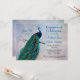 An elegant engagement party invitation featuring a vintage peacock in gorgeous hues on a painted background.