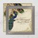 PAPER SELECTION: This is shown on "basic paper", another great choice would be "metallic ice" which is a clean white, pearl shimmery surface. It would also be beautiful on "Champagne Metallic" linen, felt or any of the other choices. COLOR PALETTE: silver metallic, tan, cream royal blue, green, and rust. DESIGN: This antique vintage inspired wedding collection has a complete ensemble of products and can be created in several colorways. If you would like it to match your wedding let us know via email and we'll be happy to assist you. This design consists of a stately peacock on a tree branch vintage art element layered three peacock feathers and over an angel etching, swirls, antique handwriting, hand painted lace overlaid parchment and a beautiful original art damask pattern. The background colour can be changed to match your wedding.