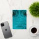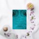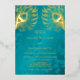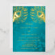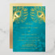 This elegant wedding invitation features real gold foil peacock feathers on a shimmering floral turquoise background.
