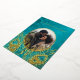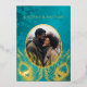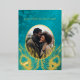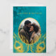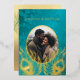 This elegant wedding invitation features a round photo surrounded by real gold foil peacock feathers on a shimmering floral turquoise background.