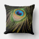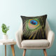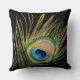 Stylish black throw pillow with colourful peacock feather close-up.