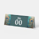 A beautiful iridescent peacock feather is set against a marbled teal blue background that makes the plume pop. Both sides of the frame have the same design and the middle has a plain dark teal background on which white editable templates for your table number appear. The lettering is bold and clear and is ideal for "peacock themed" weddings; corporate events and any celebration you may be hosting.
