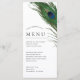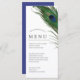 A peacock feather-themed dinner menu featuring a peacock feather towards the side and your menu details towards the bottom corner. All elements of this item are unlocked and adjustable by using the customisation function.