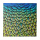 Decorative tile featuring a close up of the beautiful feathers on the nape of a peacock that form an exquisite art deco-like pattern with the colorful iridescent green, blue, bronze and yellow details of these feathers. Unique and beautiful home or garden decor for bird and nature lovers. Photo taken in Arcadia, California.