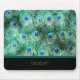 A personalised mouse pad with a brightly coloured pattern of exotic and wild peacock feathers in pretty teal, jewel green, aqua and cobalt blue. Artistic and fancy, created with watercolors. A chic and stylish design. Personalise with your name in a gold elegant font on a black strip across the bottom.