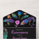 Beautiful and elegant all in one Quinceañera Invitation. This peacock feathers and floral design of purple, blue, green, and pinks makes for a very special invitation for your daughter's Quinceañera Party with the added bonus of the RSVP card attached. Easy to customise with your information. Perfect for those who love peacock feathers and flowers, set against a black background, a unique way to celebrate her 15th birthday.