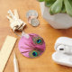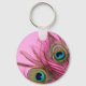 Beautiful pink keychain with colourful peacock feathers close-up.