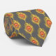 Tie in a peacock feather textile print - soft mustard gold feathers, with an eye in shades of coral orange and yellow, on a graphite grey / grey background