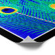 Artwork depicting peacock feather design in blue, green and gold.