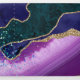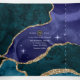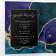 Peacock colours and faux gold glitter agate stone wedding invitation with a spacey theme customisable to your specifics. This is a full package in one with guest details and rsvp so that the recipient can just cut off the last panel and post it off.