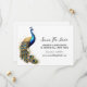 A beautiful 3D looking design featuring a single iridescent peacock in resplendant blue, emerald green, teal and gold set against a stark white background that has editable flowing calligraphy and bold style fonts on it which may be changed to any wording of your choice. This chic and stylish illustration is ideal for a country outdoor or peacock garden theme wedding, bridal shower or anniversary.