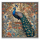 A Peacock with detailed watercolor with expressive eyes is portrayed against a soft, blurred background. The natural colours enhance the lifelike appearance.