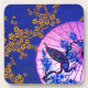 Pretty oriental floral design in gold on a royal blue background. Garnished with an illuminated pink and purple parasol that is decorated with flowers and a blue peacock.