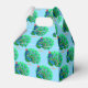 Party favour box shown in light blue with a cute cartoon peacock print.