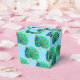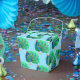 Party favour box shown in light blue with a cute cartoon peacock print.