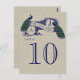 Burlap Linen Peacock Rustic Wedding Table Number Card. This gorgeous wedding table number card design is perfect for a Vintage Wedding with the ability to personalise with your monogram initials. Its unique design with Two Beautiful Peacocks on Vintage Banner and text "Mr. and Mrs." in a dark blue font all on a printed linen photo effect background, create a unique, stylish wedding table number card. Elke Clarke© Please order one table card with the first number on it. Then change the number in the edit menu and add the next table number card to your cart until you have one unique card for each table number in your cart. Need help or would like a different colour combination, please contact luxuryweddinginvitations@gmail.com