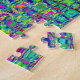 The abstract design of this jigsaw puzzle reminds me of peacock feathers. Colours include: blue, green, violet, purple, pink, orange, yellow and red. This challenging puzzle will provide hours of fun!